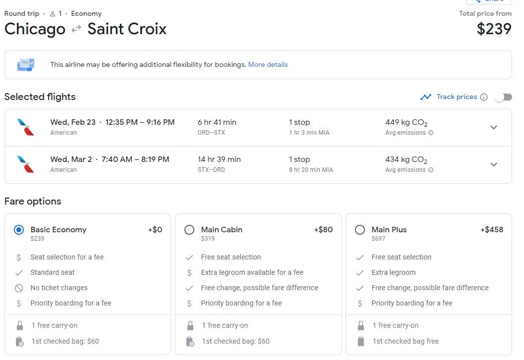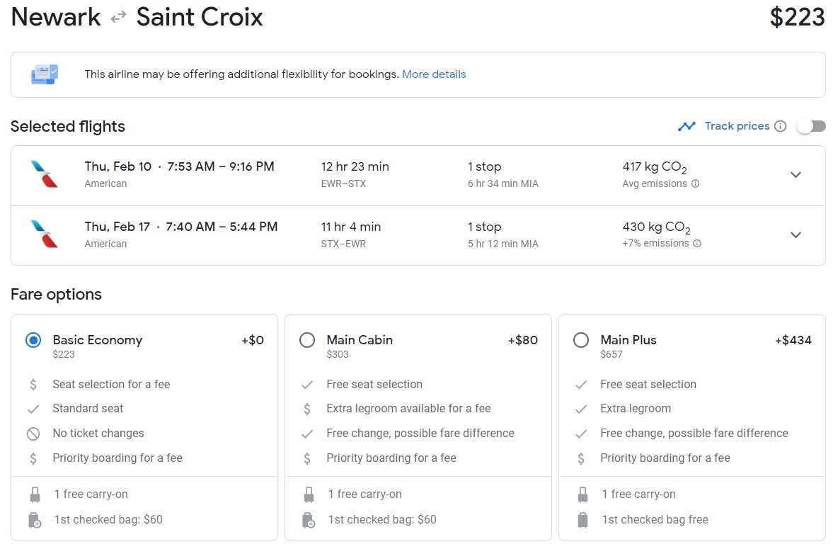 There are options throughout February for round-trip flights from Dallas (DFW) to St. Croix (STX) at $221 with a stop in Miami (MIA).