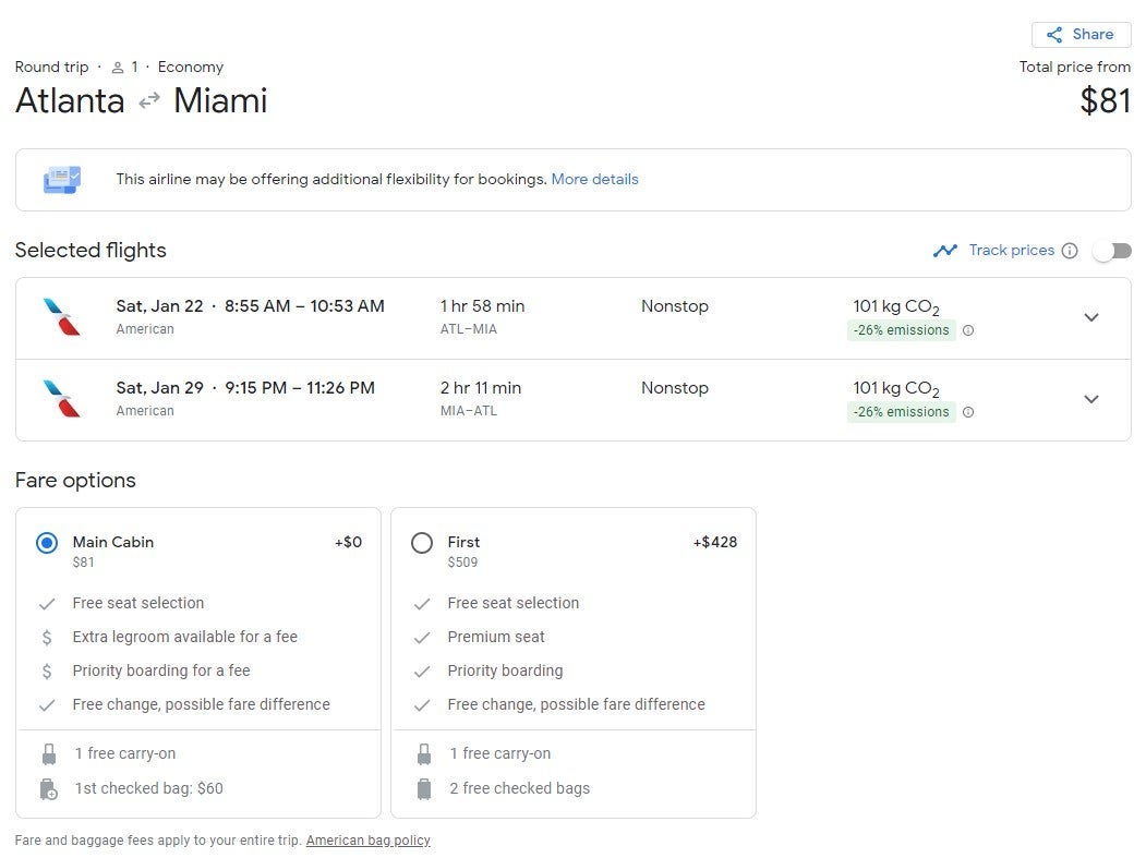 One of the cheapest flights we found was for $81 round-trip from Atlanta (ATL) to Miami (MIA) at the end of January via American Airlines. This Main Cabin fare includes free seat selection and one free carry-on, making it an especially good deal.