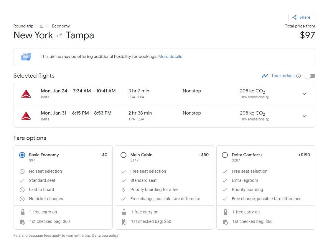 We found a nonstop flight from New York (LGA) to Tampa (TPA) at the end of January for $97 round-trip on Delta. The basic economy fare includes a free carry-on item.