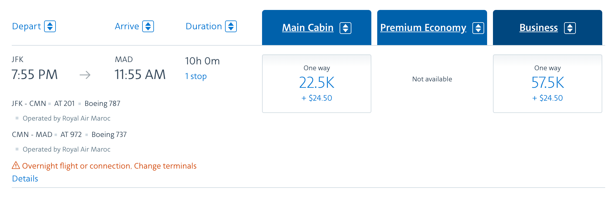 But that's not to say that booking with AAdvantage miles is a bad deal. As noted above, American recently moved Morocco from its Africa to Europe on its award chart, so a one-way business class ticket from the U.S. to Casablanca (or vice-versa) costs 57,500 miles. Plus, since the award space shows on AA.com, you can book these award tickets without having to call the airline.