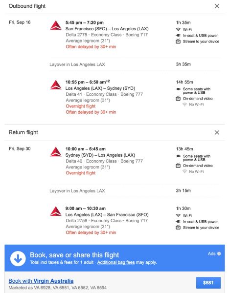 San Francisco (SFO) to Sydney (SYD) for $581 on Delta in September: