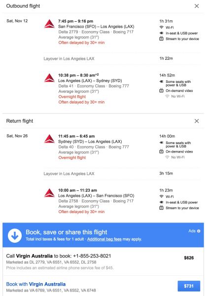 San Francisco (SFO) to Sydney (SYD) for $626 on Delta in November: