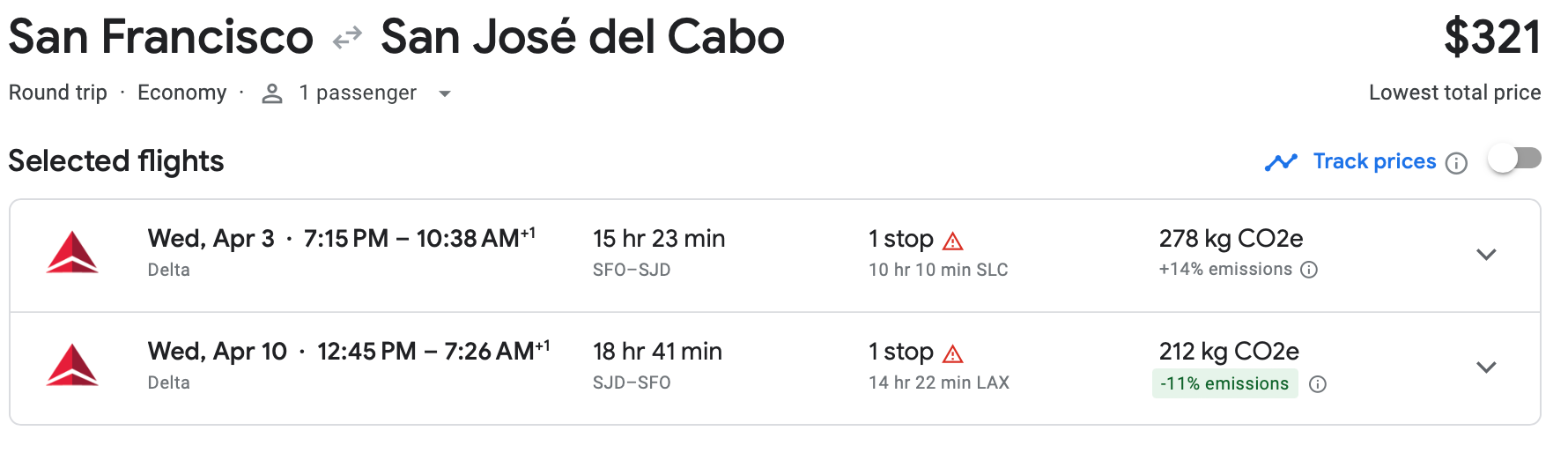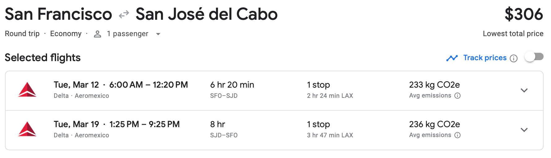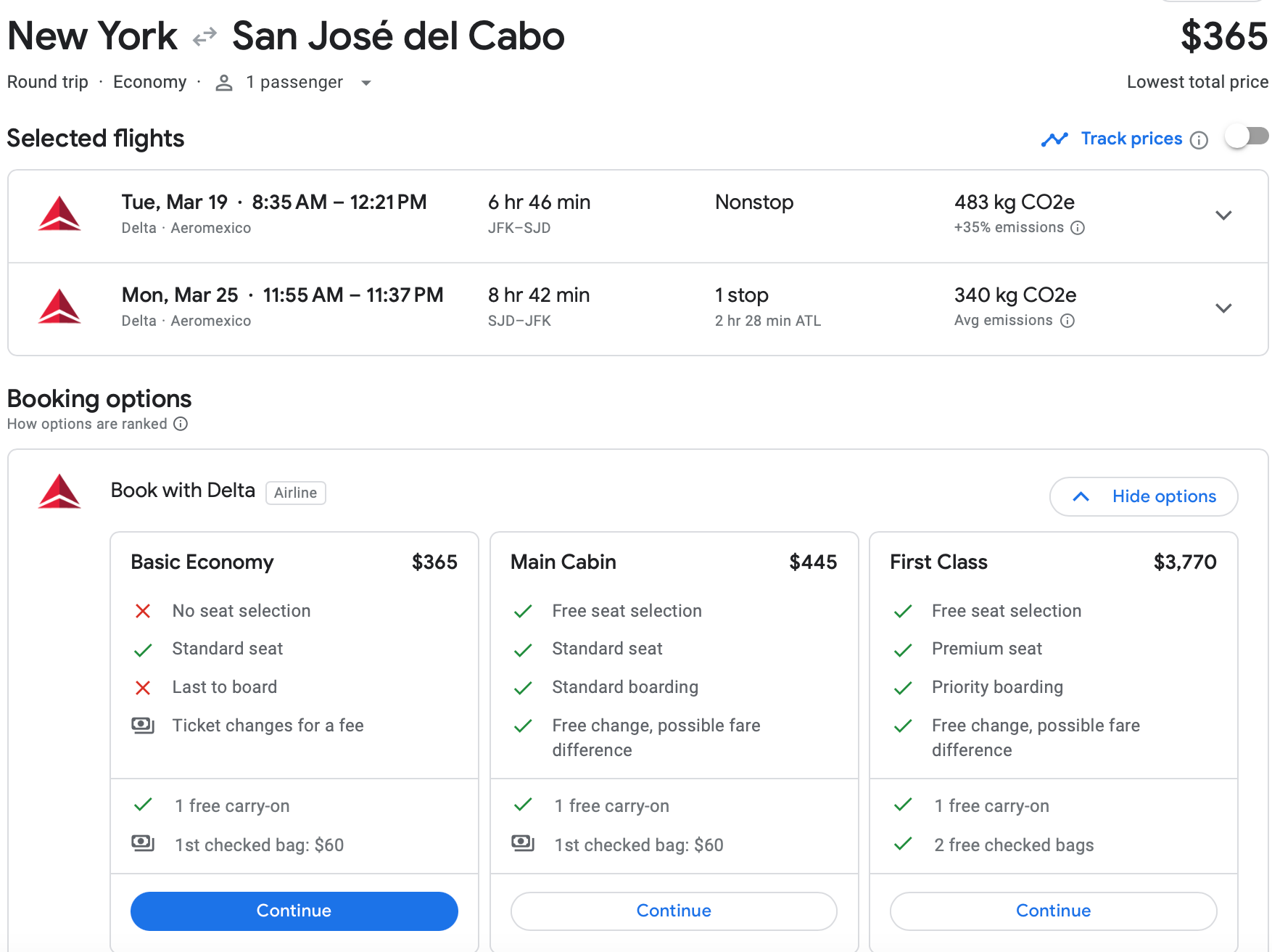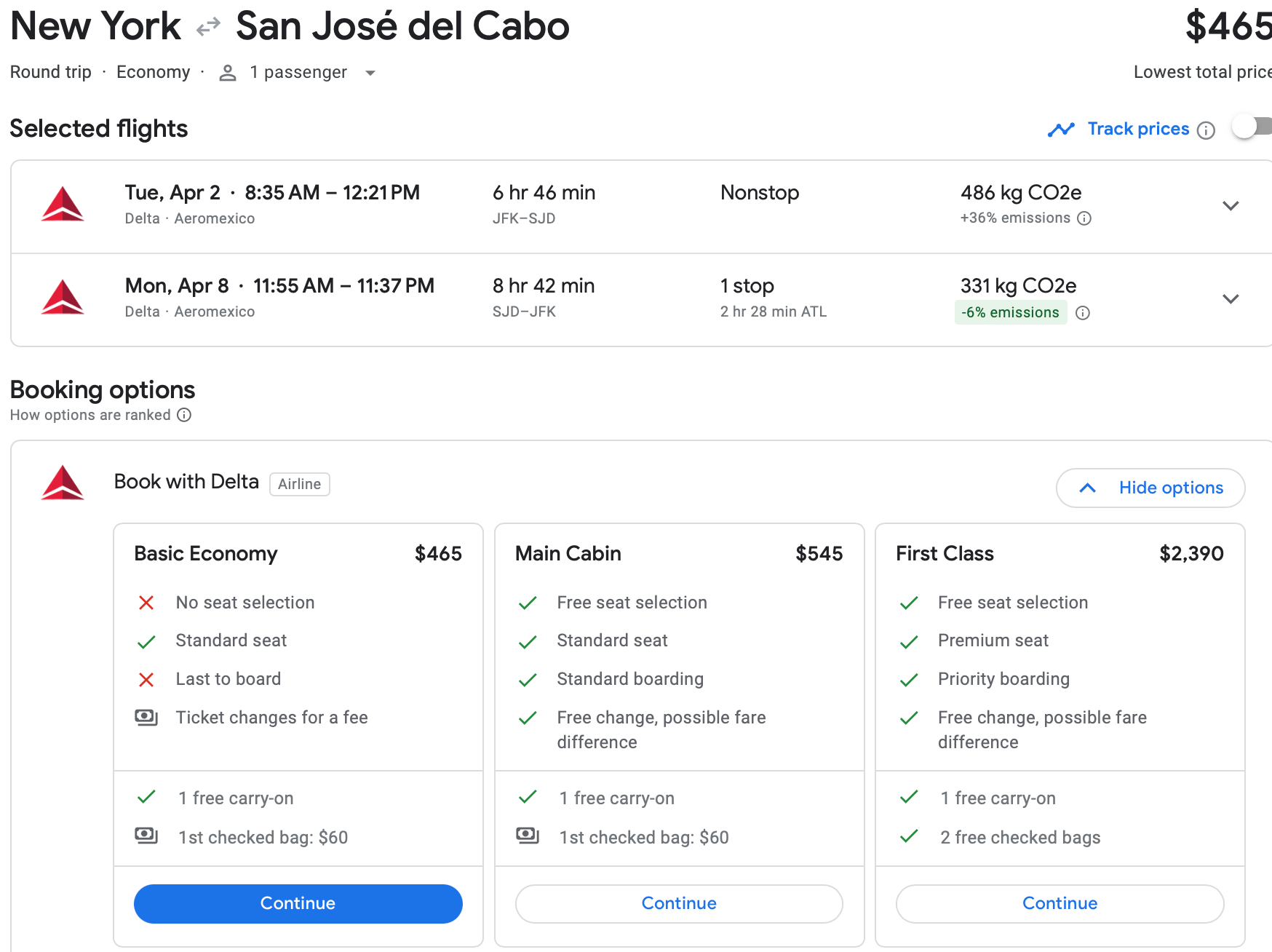 For example, you can book a ticket in March out of New York's John F. Kennedy International Airport (JFK) to Los Cabos International Airport (SJD) for $365 round-trip. It's a basic economy ticket, which means you get a free carry-on. You fly nonstop to San Jose del Cabo, but you'll have a layover in Atlanta on your return flight.