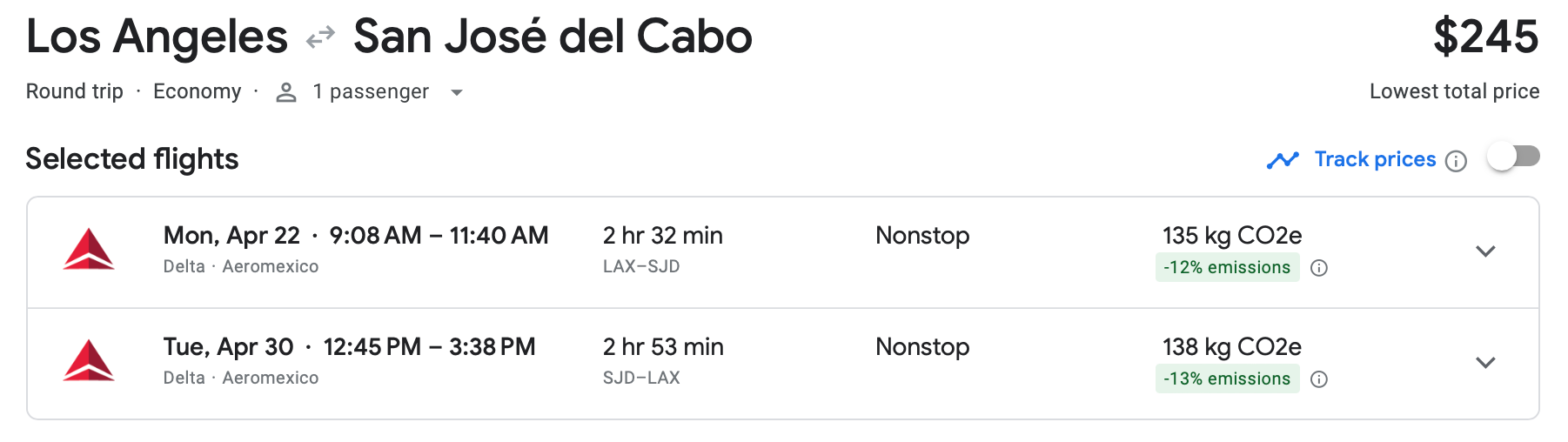 We found more good prices out of Los Angeles in late April, like this $245 fare for a nonstop flight. Again, it's a basic economy ticket, but you're heading to the beach, so you should be able to get away with just using a carry-on bag.