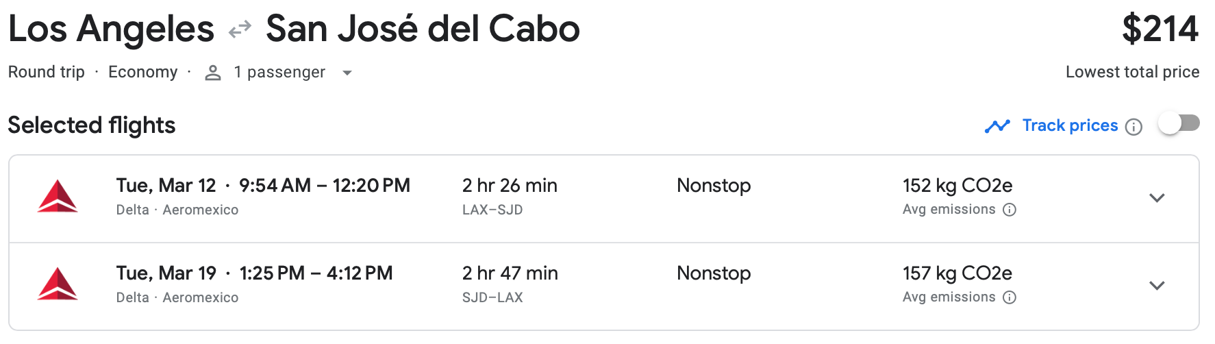 If you live in Los Angeles, you can fly from Los Angeles International Airport (LAX) to Los Cabos International Airport (SJD) in mid-March for just $214 round-trip. That's a great deal, especially for a nonstop flight.