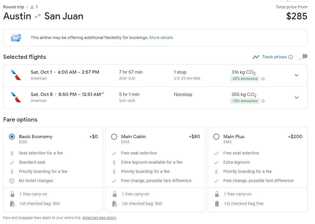 There are flights available from Austin (AUS) to San Juan (SJU) at the price of $285 round trip. The departure flight includes a stop in Miami (MIA) and the return flight is direct.