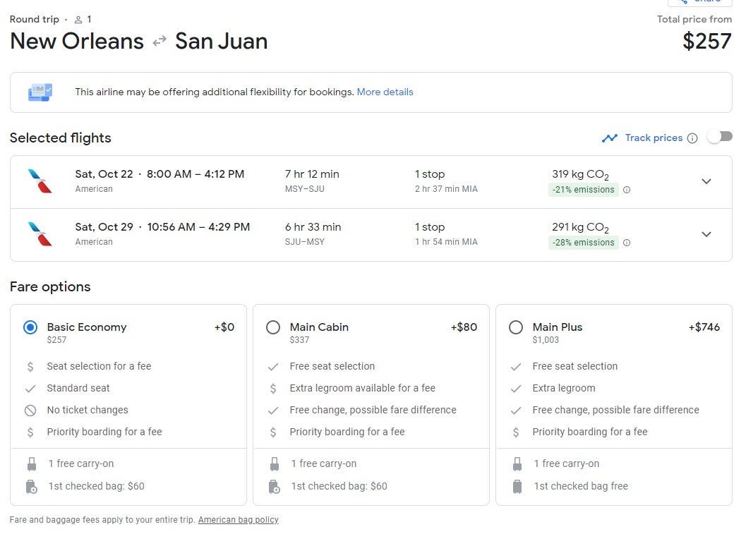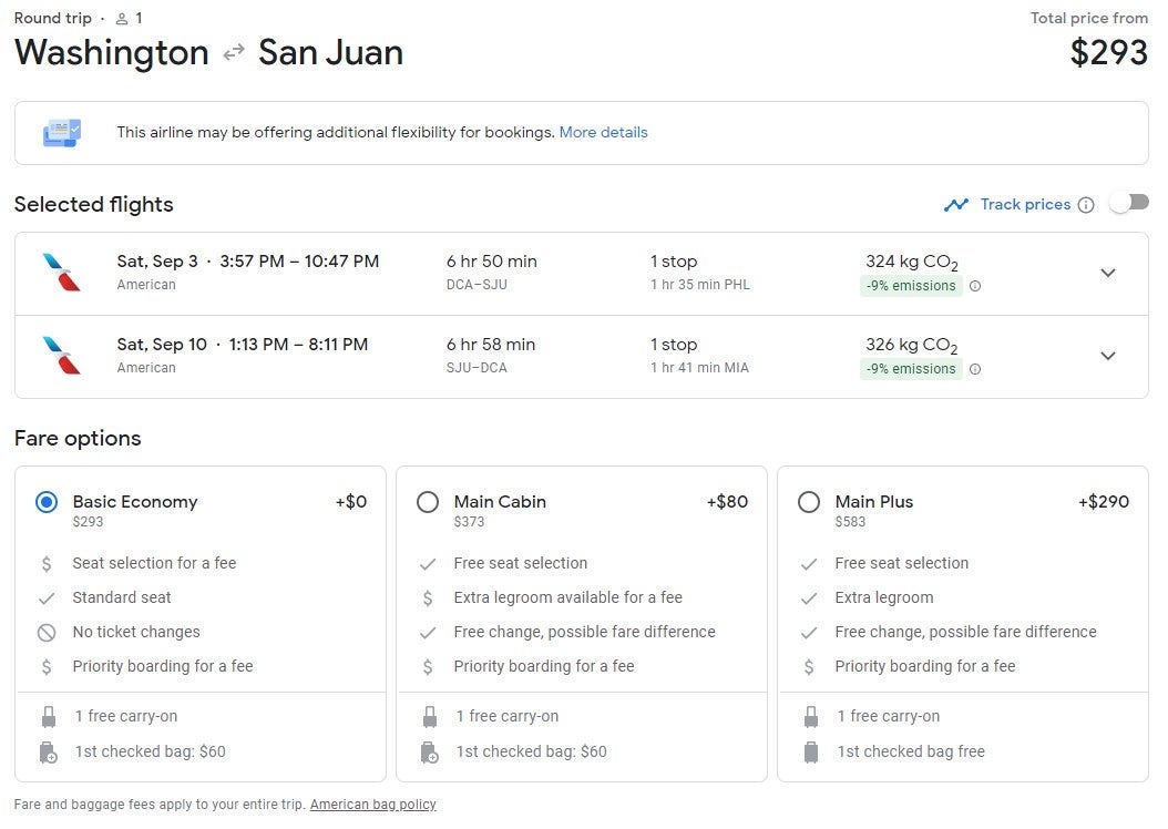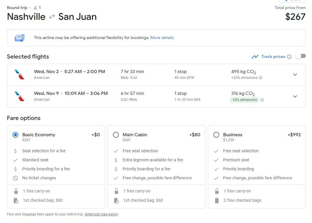 The deals below are for basic economy tickets on American Airlines, which include a carry-on. A checked bag will cost $30 each way.