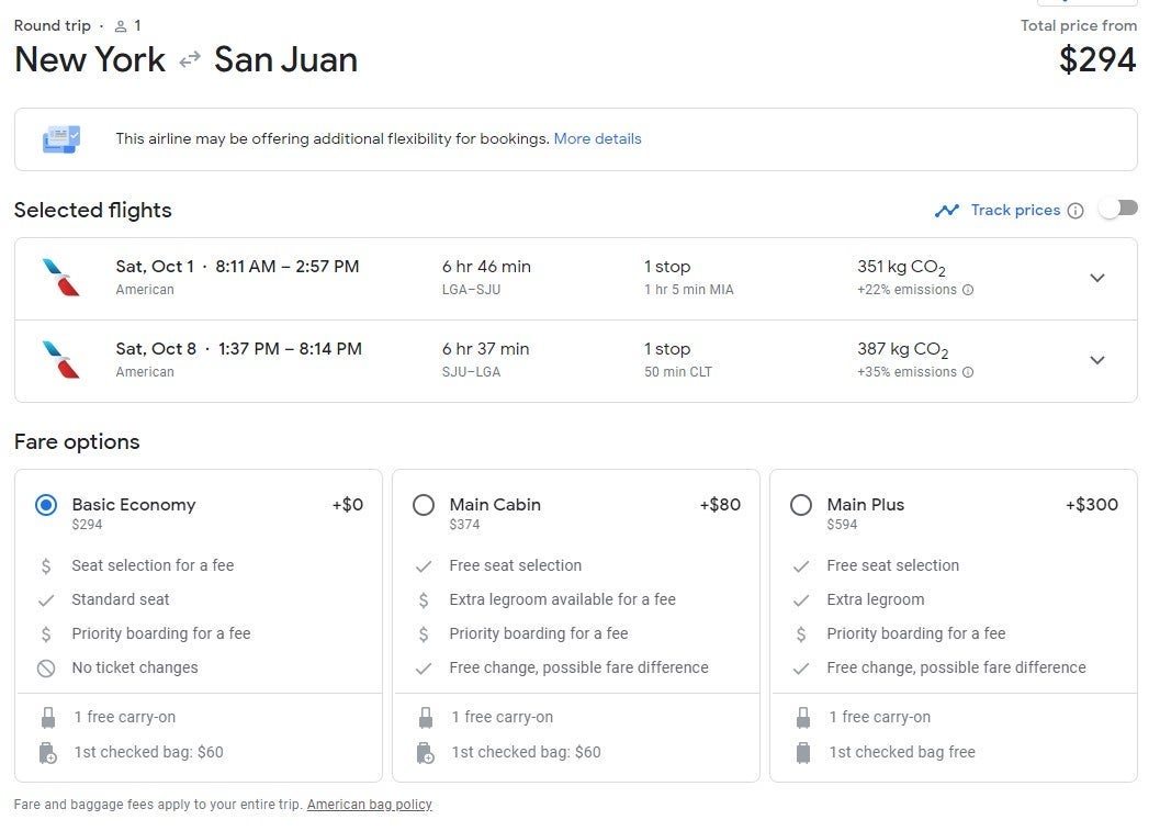 If you’re flying from New York (LGA) to San Juan (SJU), you can book a flight for as low as $294 round trip. There is a stop in Miami (MIA) on the departure and a short layover in Charlotte (CLT) when returning.