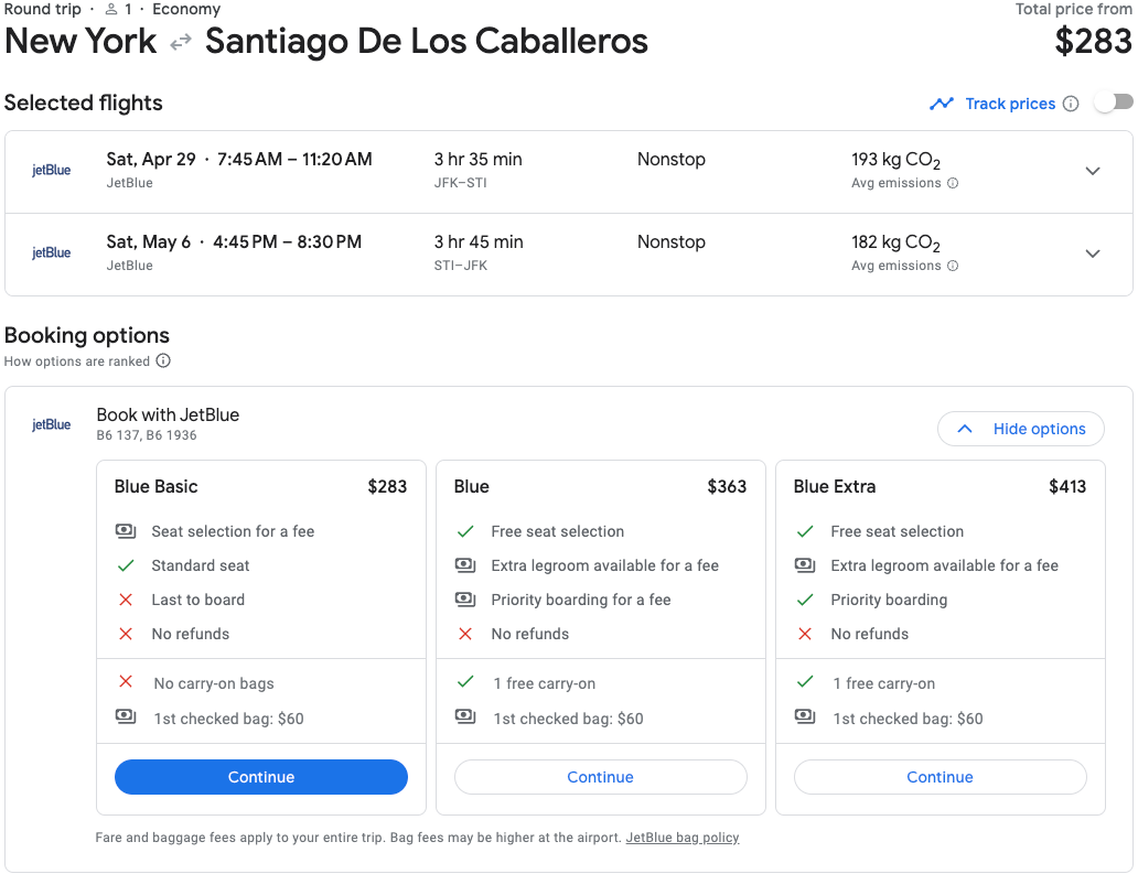 The following round-trip flights to Cibao International Airport (STI) were priced as listed at the time of publication. We cannot guarantee the below round-trip flights will be available when you book: