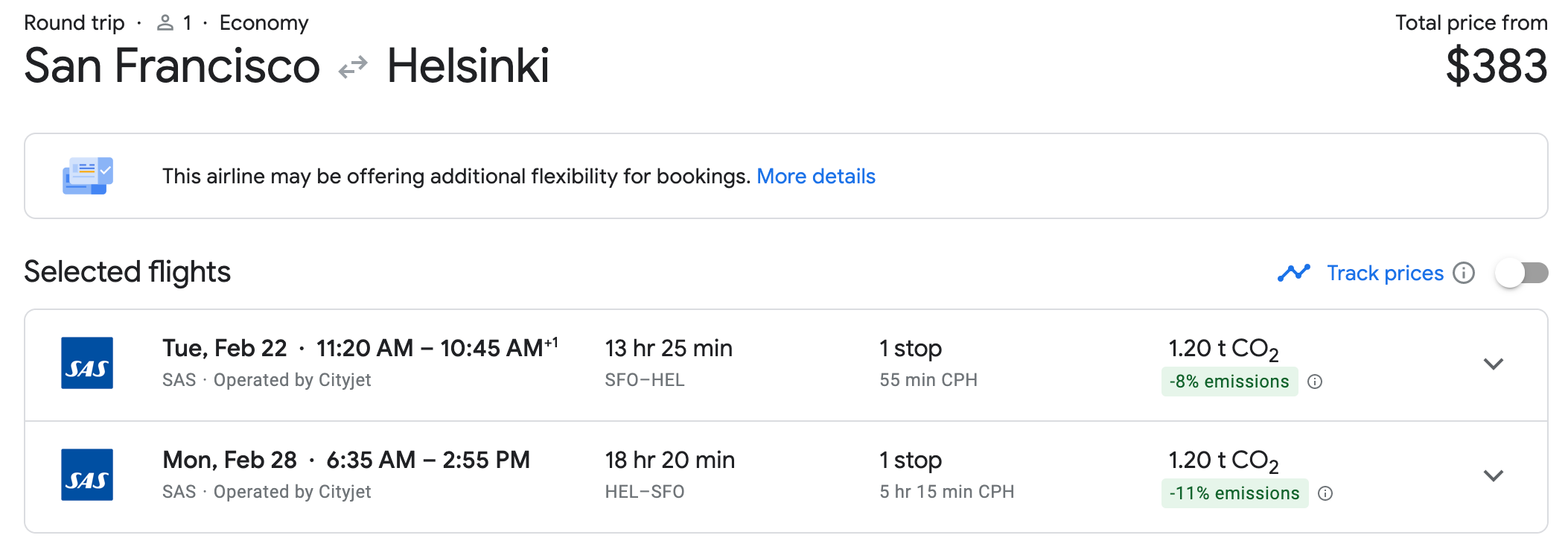 San Francisco (SFO) to Helsinki (HEL) for $383 round-trip