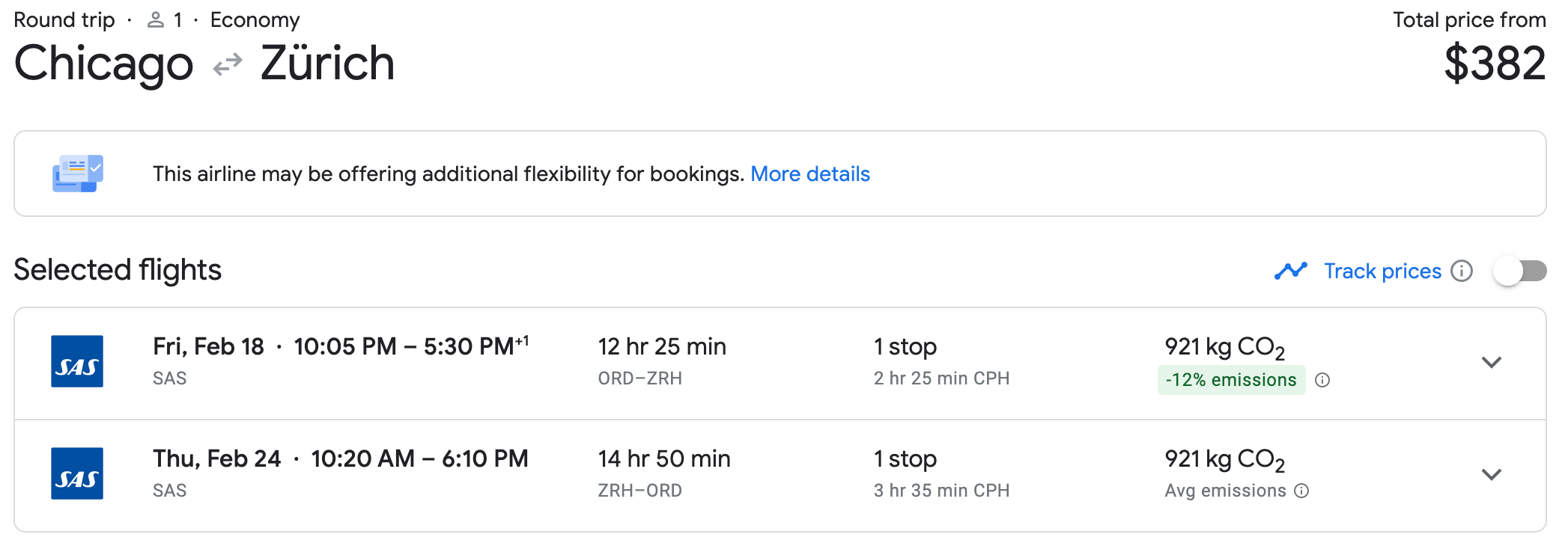 Chicago (ORD) to Zurich (ZRH) for $382 round-trip