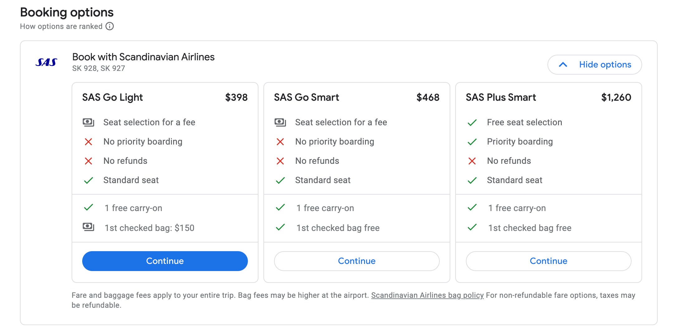 The sale applies to fares in the SAS Go Light level. Tickets include a personal item and a larger carry-on bag. If you want to check a suitcase, it'll cost $75 each way. Or, you could upgrade to the SAS Go Smart level for an extra $35 each way because those fares include checked bags.