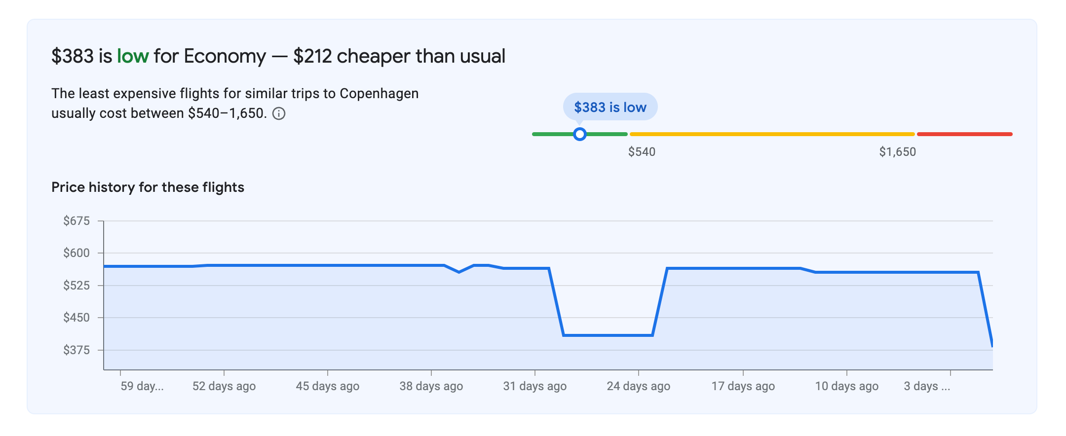 As you can see below, fares are considerably lower than usual. Also, because you would be traveling during the offseason, accommodations in Copenhagen will be much cheaper than they are in the summer.