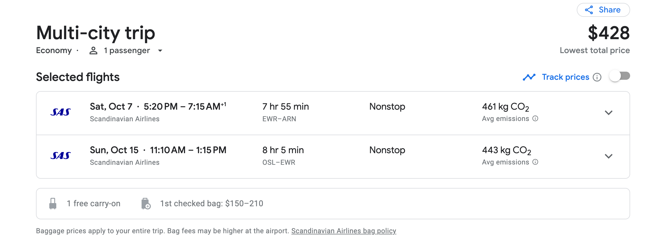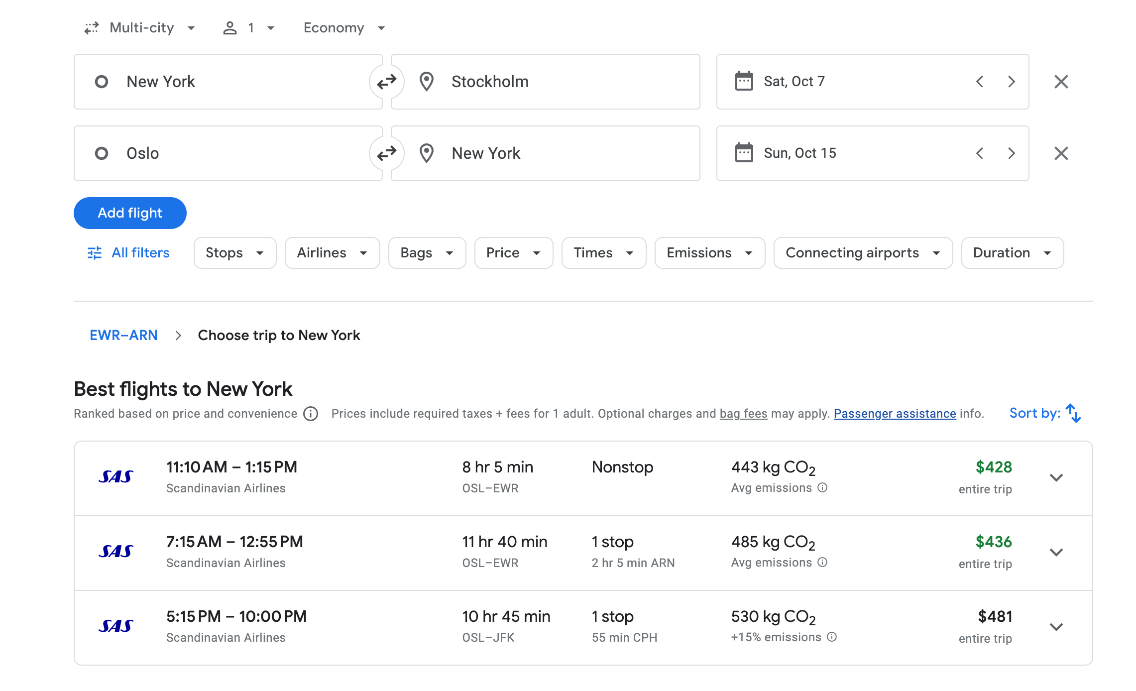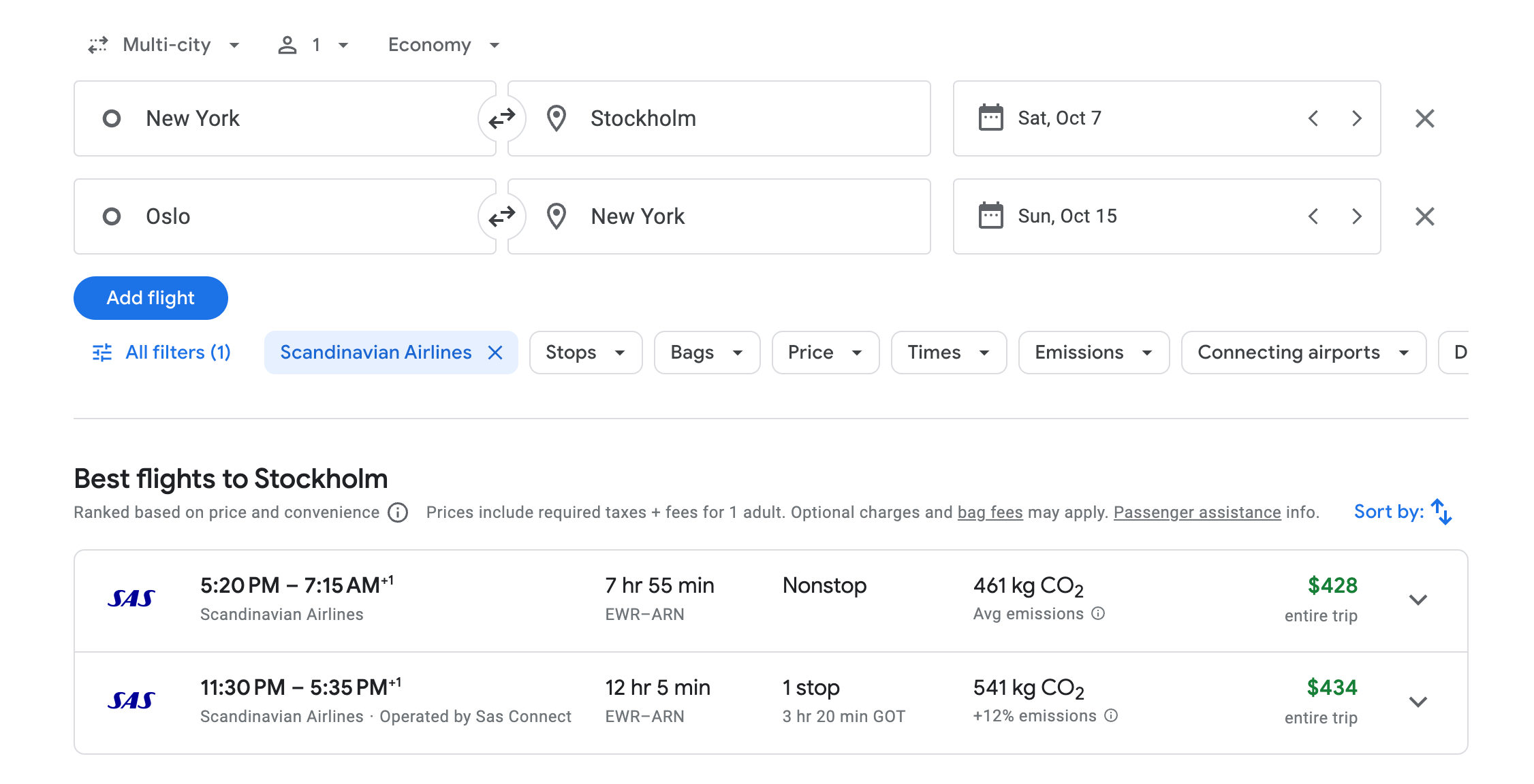 If you want to capitalize on these deals by visiting multiple European destinations, use the multicity feature on Google Flights to plan your open-jaw trip. Below is a sample itinerary from New York City to Stockholm and Oslo.