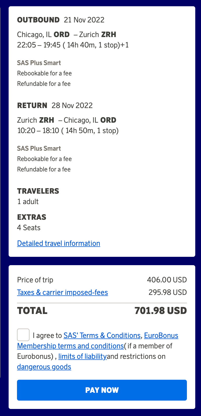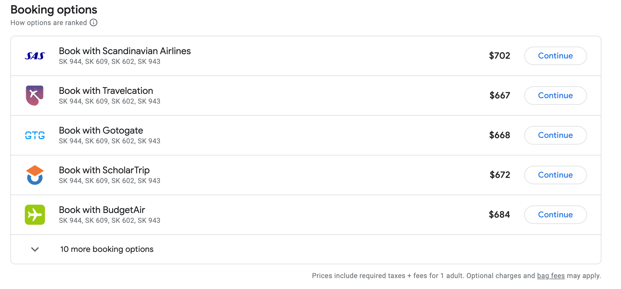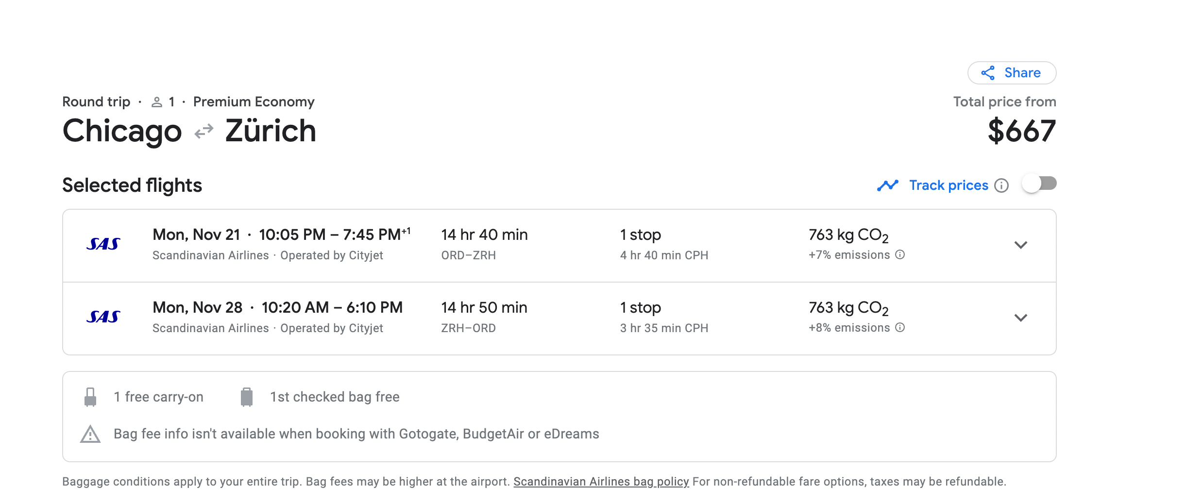 For many of these SAS flights, prices on Google Flights are lower than whatever is advertised on SAS' website. For example, Google Flights shows the fare for a Nov. 21 to Nov. 28 flight to Zurich as $667 because there are many third-party booking options available. The price on SAS's website for such a trip is $702.