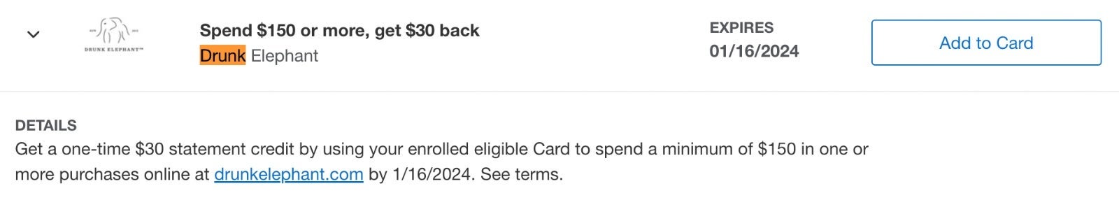 • Drunk Elephant: Spend $150 or more and get a $30 cash-back statement credit. Offer ends Jan. 16, 2024.