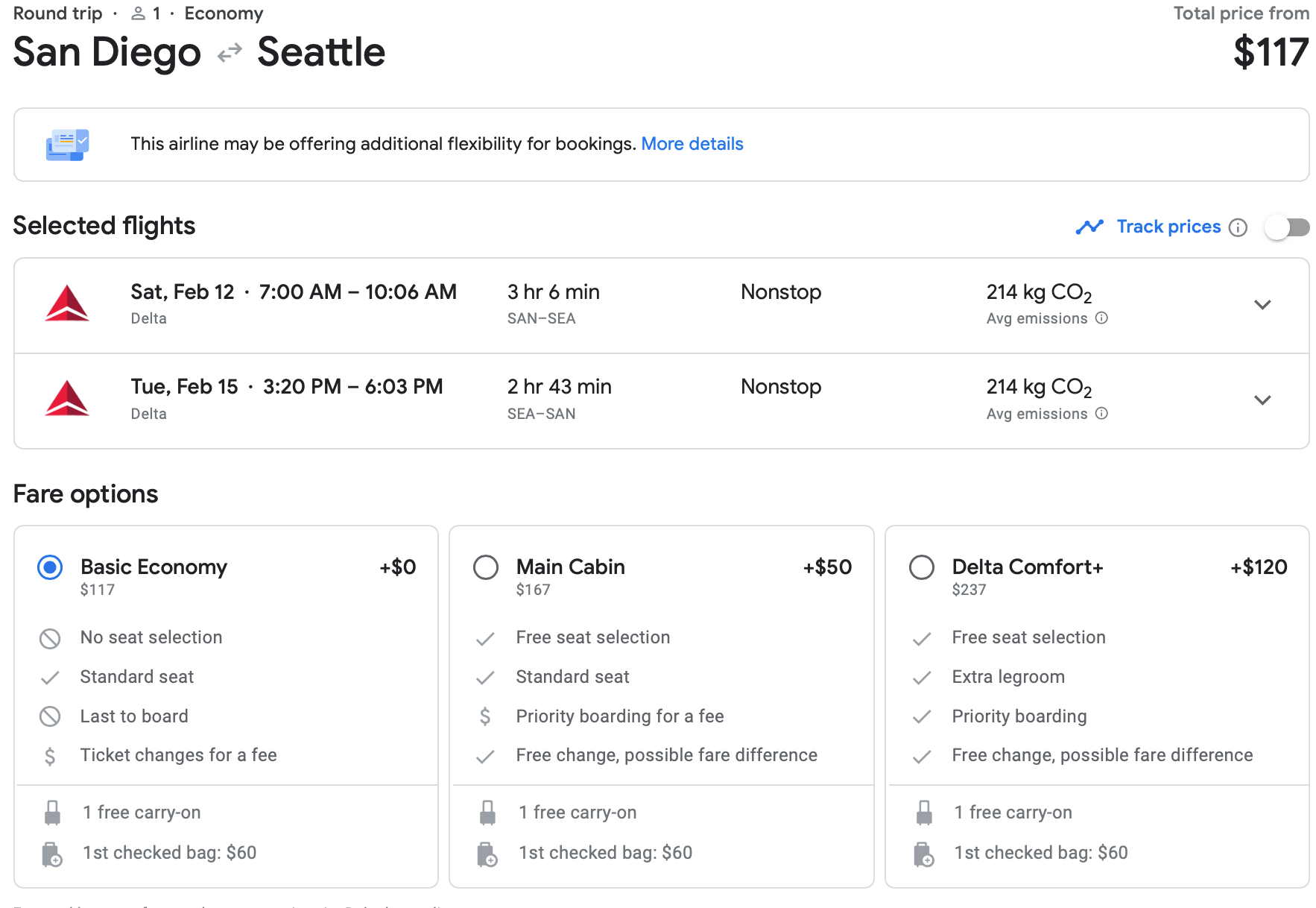 San Diego (SAN) to Seattle (SEA) is available on Delta for $117 in February. It's for Delta's Basic Economy which comes with a free carry-on but you're the last to board. On the plus side, it's a nonstop itinerary and there was a lot of flights to choose from. Also, if you do feel the need to upgrade, it's just $50 to go to the Main Cabin.