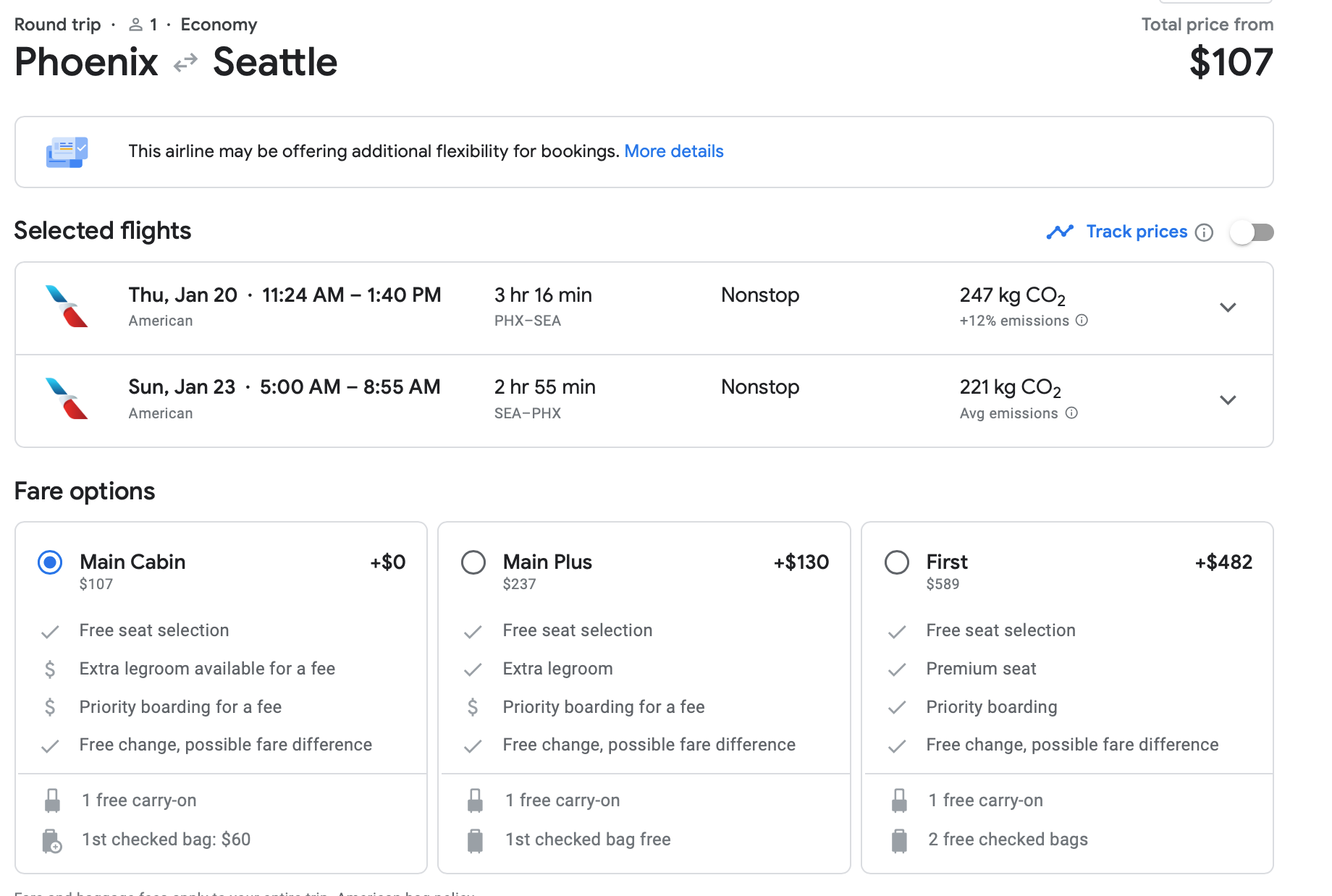 One of the lowest fares we saw was a nonstop on American from Phoenix (PHX) to Seattle (SEA) in January for just $107 round-trip. This is a Main Cabin seat.