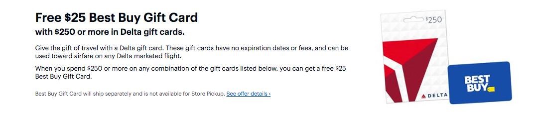 - $25 Best Buy gift card if you spend $250 or more in Delta gift cards, which have no expiration date and can be used toward airfare on any Delta-marketed flight.