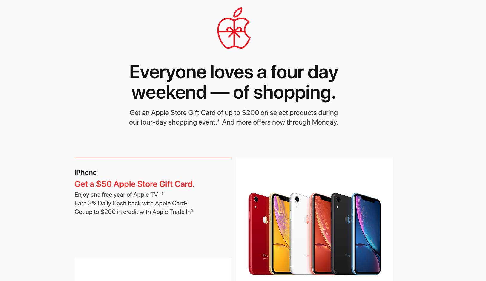 - You can get an Apple Store gift card from $25 of up to $200 if you buy select Apple products (iPhone XR, iPhone 8, Apple Watch Series 3, AirPods, iPad Prp, iPad Air, iPad mini, Mac desktops and laptops, Apple TV and HomePod plus various headphone models.)