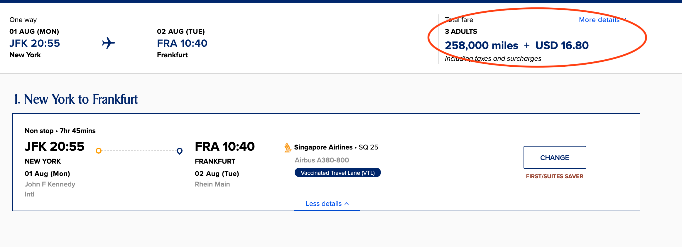 There was a lot of availability for Singapore Suites on the A380 between New York-JFK and Frankfurt (FRA) from March and August 2022. Many flights had at least one seat at that price, but some had two or three Saver awards available. That's quite unusual because the airline normally doesn't release many award offerings in its suite class that far in advance.