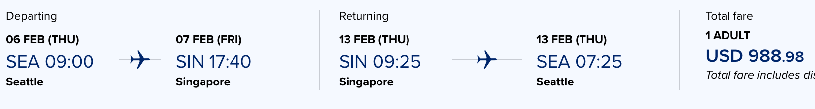 Seattle (SEA) to Singapore (SIN) for $989 round-trip nonstop in premium economy: