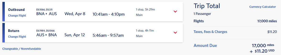 Nashville, TN (BNA) to Austin, TX (AUS) for 17,000 miles + $11.20 in taxes and fees round-trip in main cabin economy: