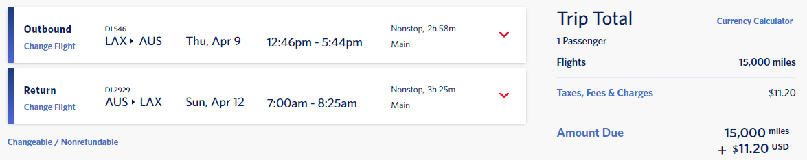 Los Angeles, CA (LAX) to Austin, TX (AUS) for 15,000 miles + $11.20 in taxes and fees round-trip nonstop in main cabin economy: