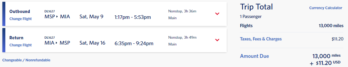 Minneapolis, MN (MSP) to Miami, FL (MIA) for 13,000 miles + $11.20 in taxes and fees round-trip nonstop in main cabin economy: