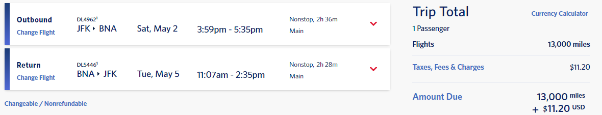 New York City, NY (JFK) to Nashville, TN (BNA) for 13,000 miles + $11.20 in taxes and fees round-trip nonstop in main cabin economy: