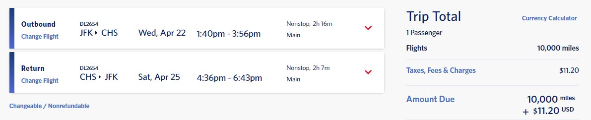 New York City, NY (JFK/LGA) to Charleston, SC (CHS) for 10,000 miles + $11.20 in taxes and fees round-trip nonstop in main cabin economy: