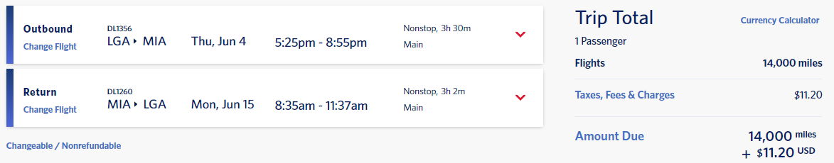 New York City, NY (LGA) to Miami, FL (MIA) for 14,000 miles + $11.20 in taxes and fees round-trip nonstop in main cabin economy: