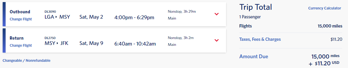 New York City, NY (JFK/LGA) to New Orleans, LA (MSY) for 15,000 miles + $11.20 in taxes and fees round-trip nonstop in main cabin economy: