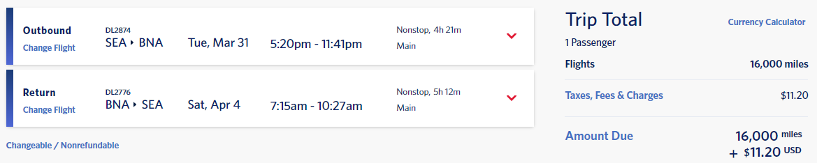 Seattle, WA (SEA) to Nashville, TN (BNA) for 16,000 miles + $11.20 in taxes and fees round-trip nonstop in main cabin economy: