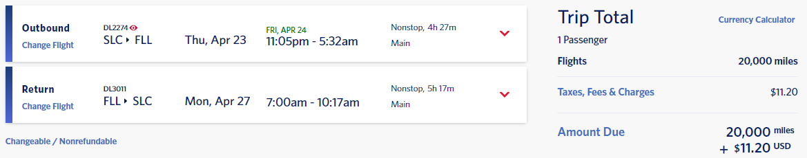 Salt Lake City, UT (SLC) to Fort Lauderdale, FL (FLL) for 20,000 miles + $11.20 in taxes and fees round-trip nonstop in main cabin economy: