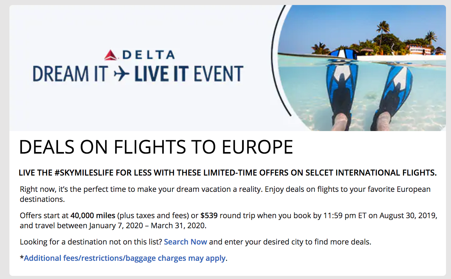 Of course, if you're also in need of a hotel stay to go with your flight, be sure to check out the current Delta Vacations promotion (ends Aug. 30) that offers double the value for your SkyMiles when you use them toward a flight + hotel package, as this may offer a better option.