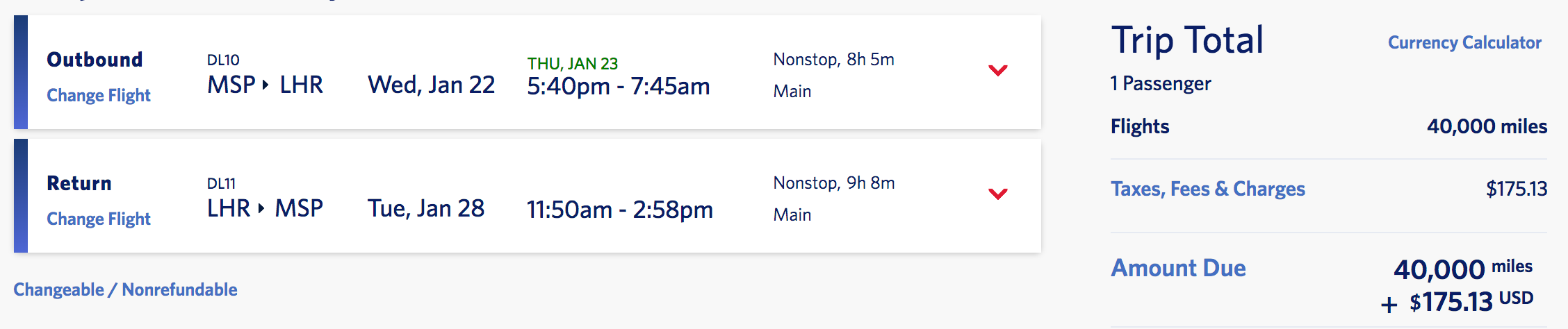Minneapolis (MSP) to London (LHR) for 40,000 miles + $175 round-trip nonstop: