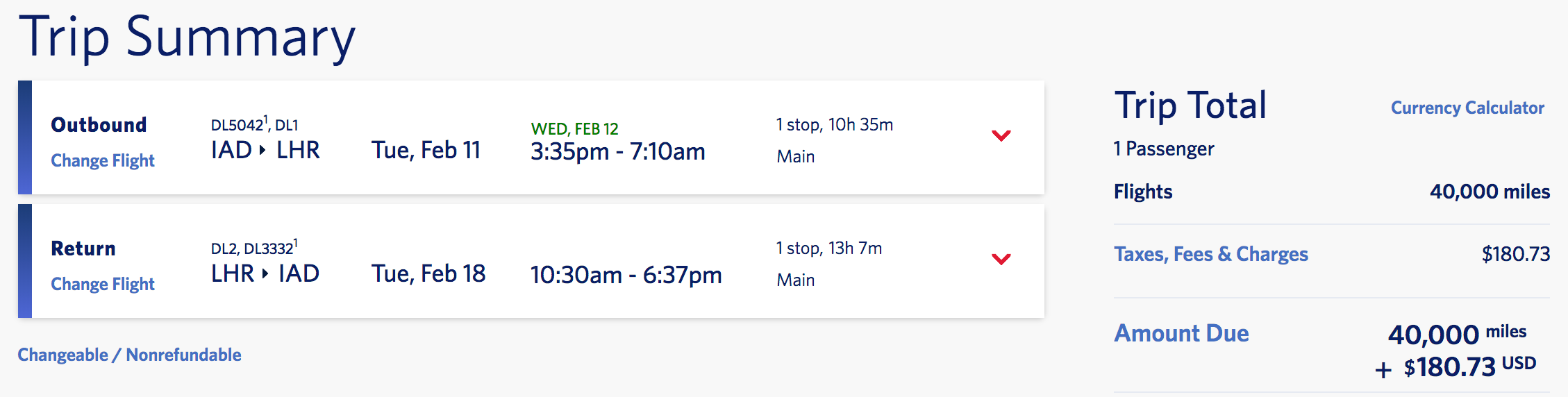 Washington (IAD) to London (LHR) for 40,000 miles + $181 round-trip: