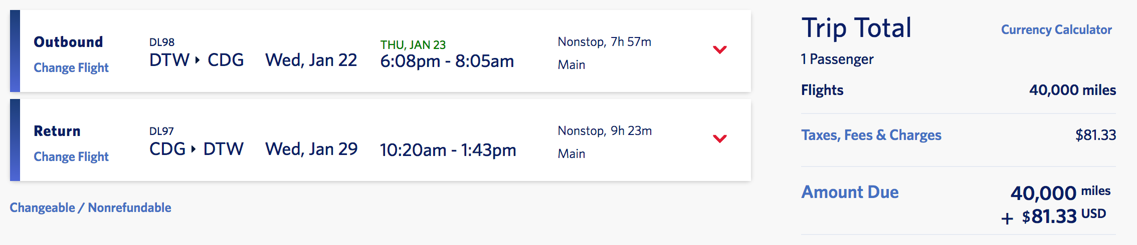 Detroit (DTW) to Paris (CDG) for 40,000 miles + $81 round-trip nonstop: