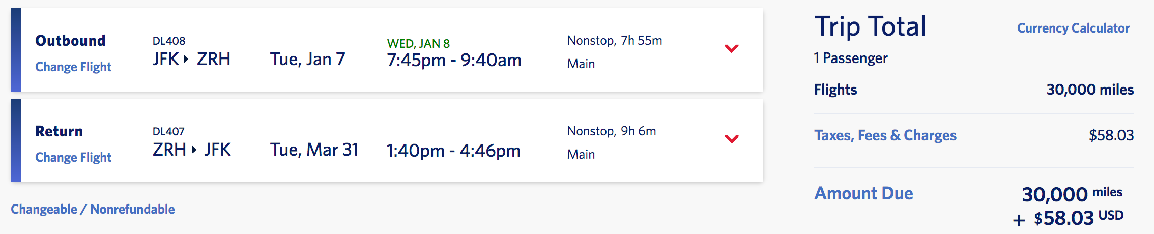 New York (JFK) to Zurich (ZRH) for 30,000 miles + $58 round-trip nonstop: