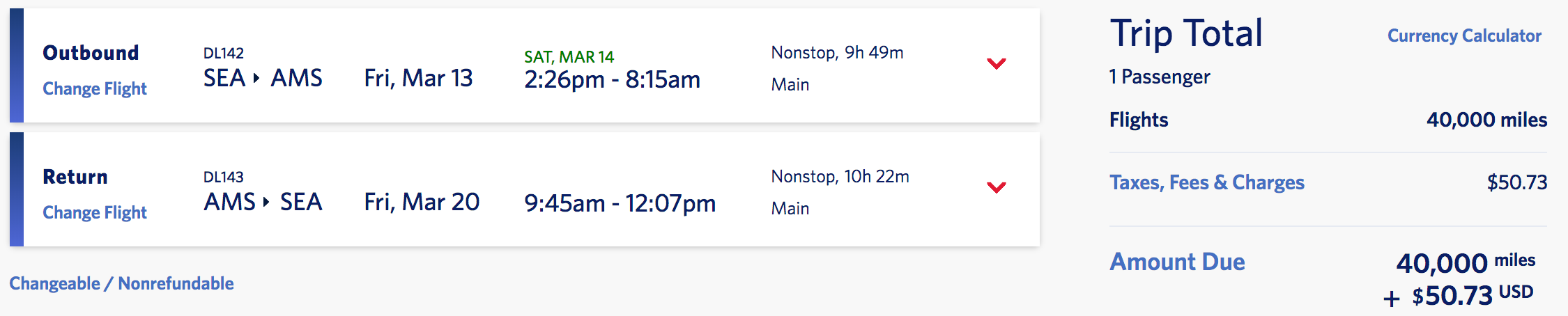 Seattle (SEA) to Amsterdam (AMS) for 40,000 miles + $51 round-trip nonstop: