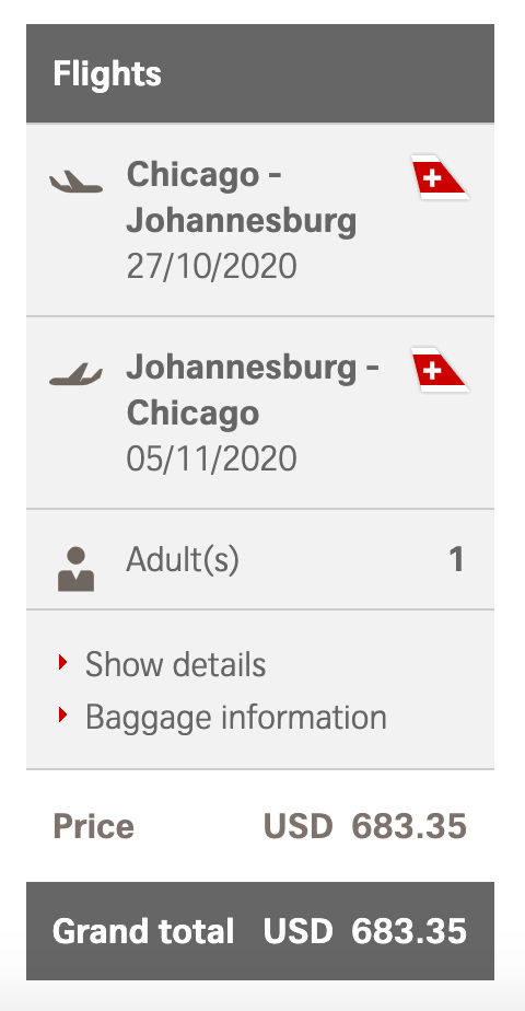 Chicago (ORD) to Johannesburg (JNB) for $684 round-trip on SWISS (multi-hour layovers in Zurich):