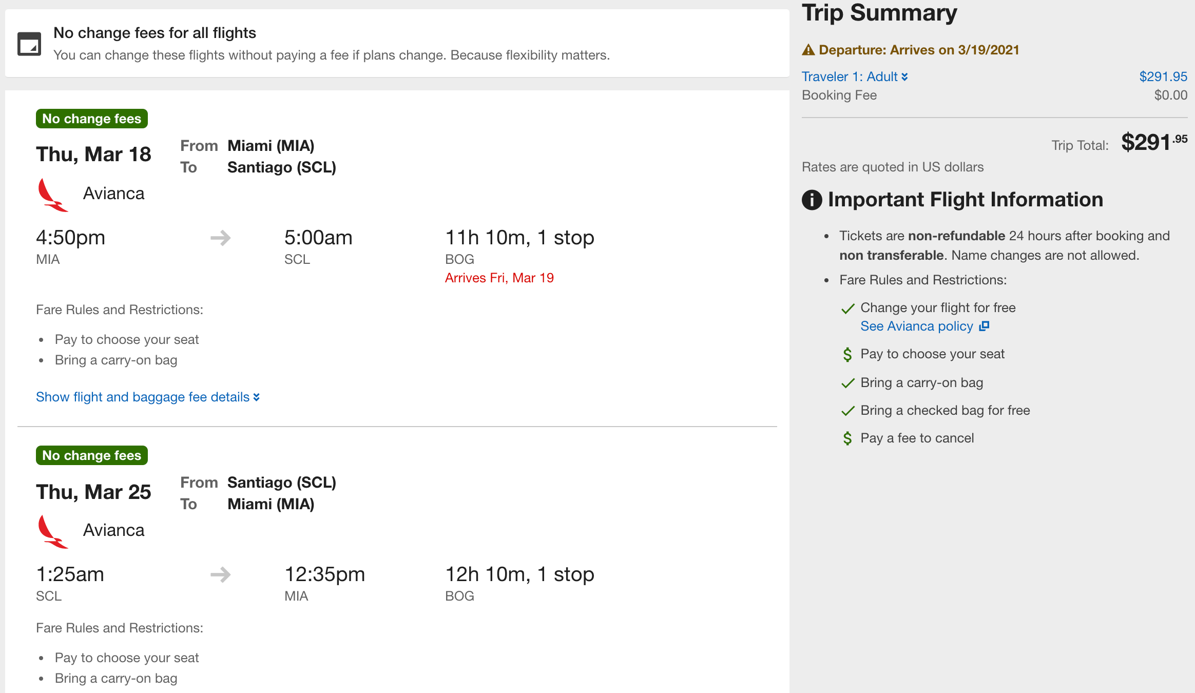 Miami (MIA) to Santiago (SCL) for $292 round-trip on Avianca: