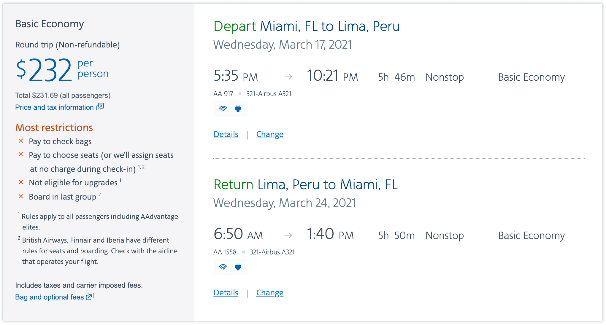 Miami (MIA) to Lima (LIM) for $232 round-trip nonstop on American Airlines in basic economy ($272 in standard economy):