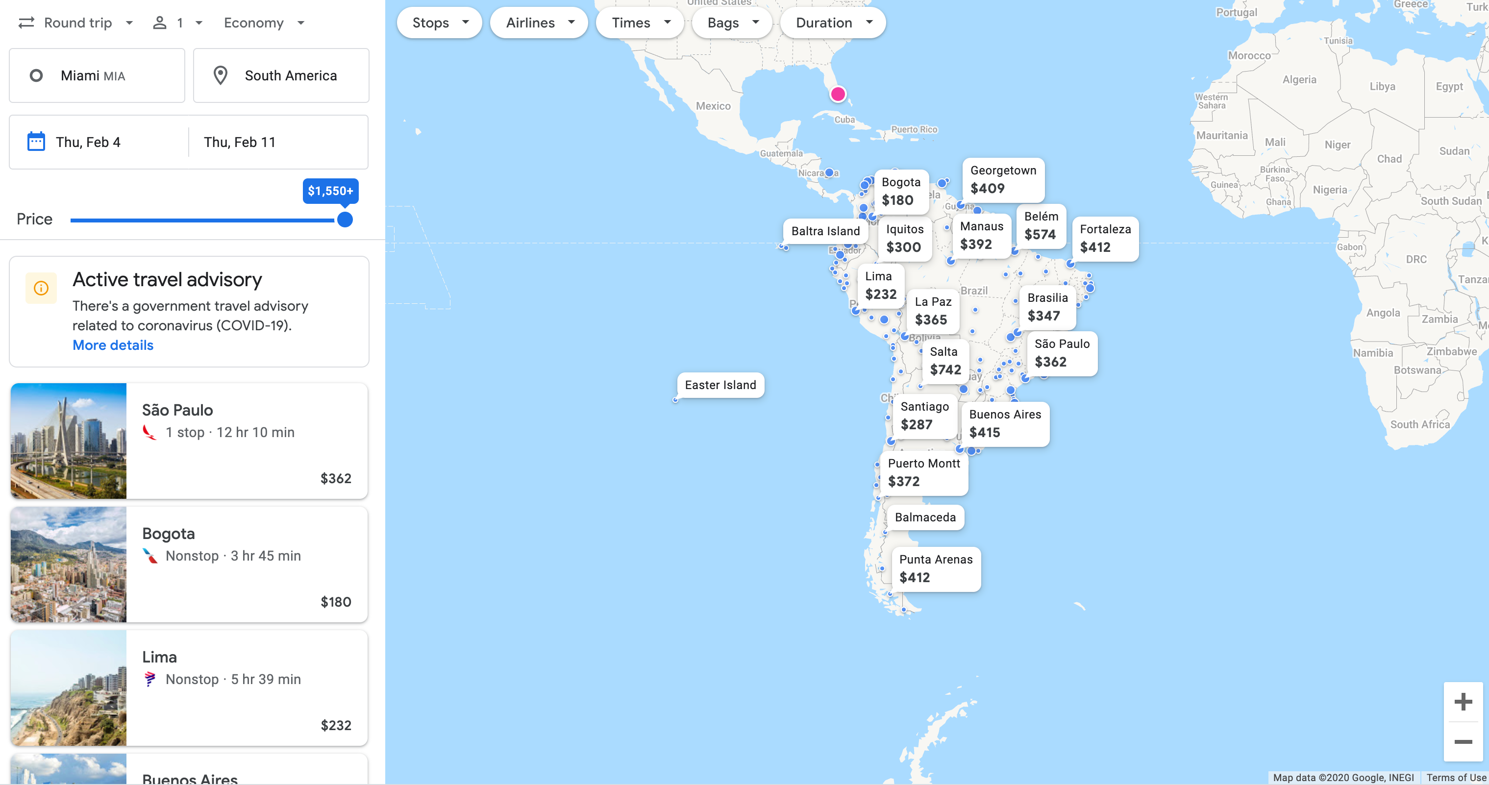 Finding these bargains is easy. Just head to Google Flights and plug in your desired departure and destination cities. Use the calendar function to find dates and prices that work for you and then click through to book with the airline directly or an OTA such as Expedia or Priceline. If you don't have a specific destination in mind, type "South America" in the "Where to?" field for a map showing the cheapest flights to destinations around the continent for your desired dates.