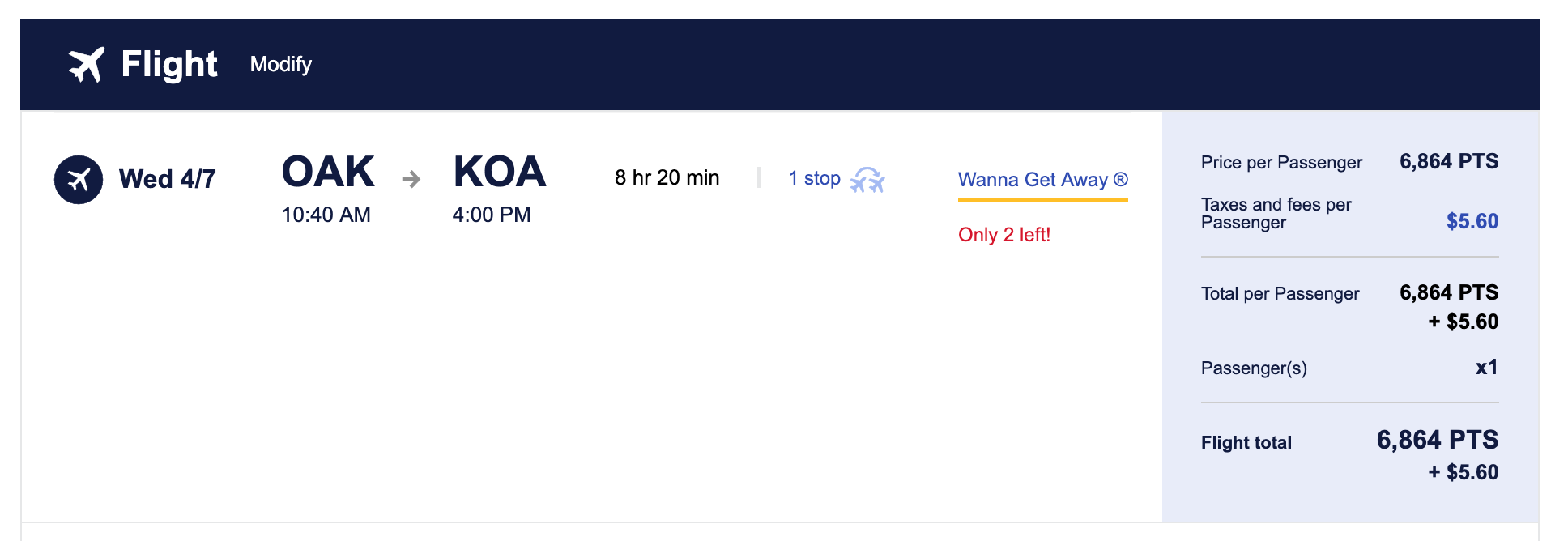 Oakland (OAK) to Kona (KOA) for $99 or 6,864 Rapid Rewards points each way