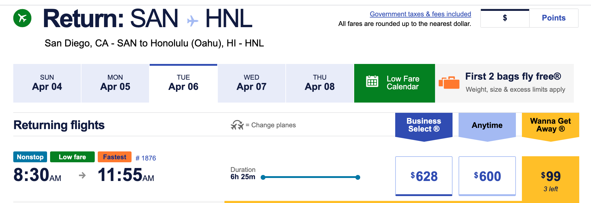 San Diego (SAN) to Honolulu (HNL) for $99 or 6,864 Rapid Rewards points each way