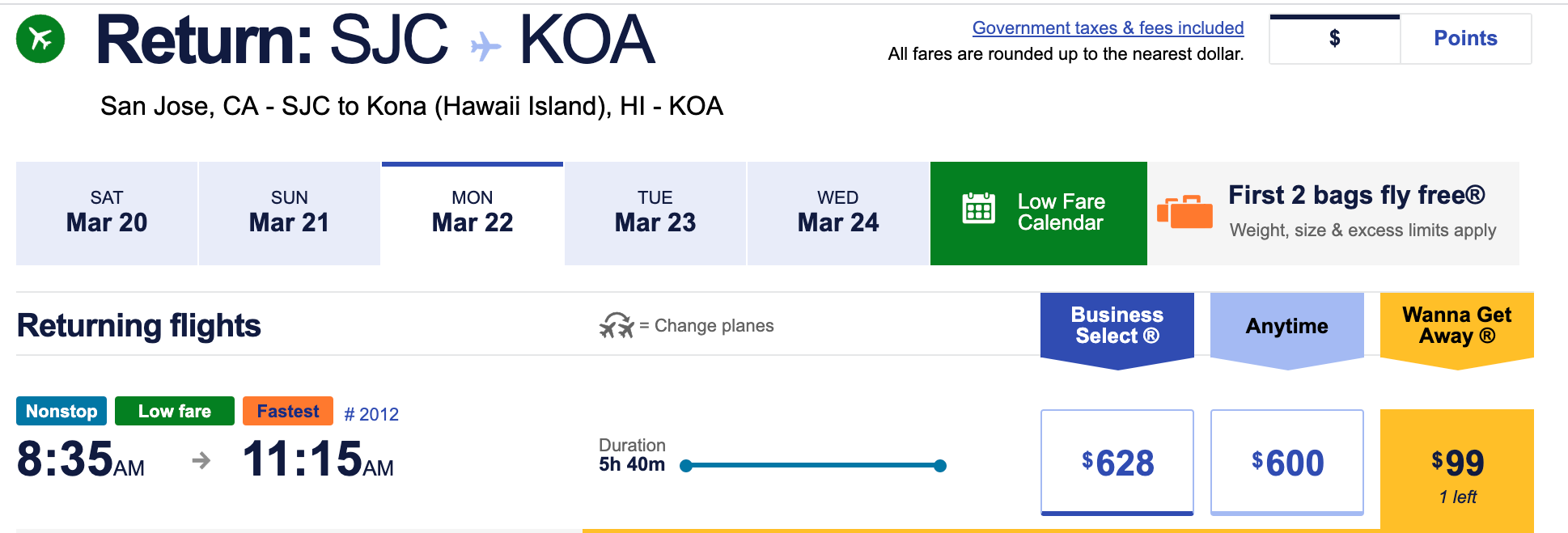 San Jose (SJC) to Kona (KOA) for $99 or 6,864 Rapid Rewards points each way