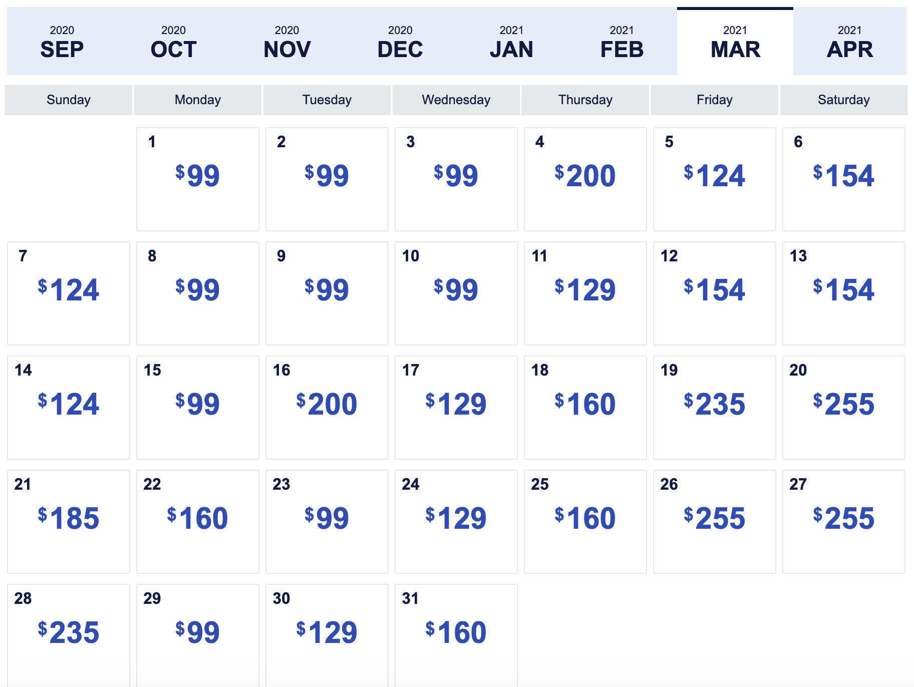 To book these Southwest flights, you'll need to head to Southwest Airline's website. The airline's "Low Fare" calendar is very handy if you are looking to quickly spot the cheapest fares.
