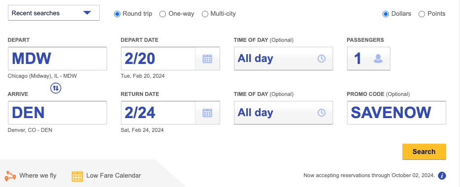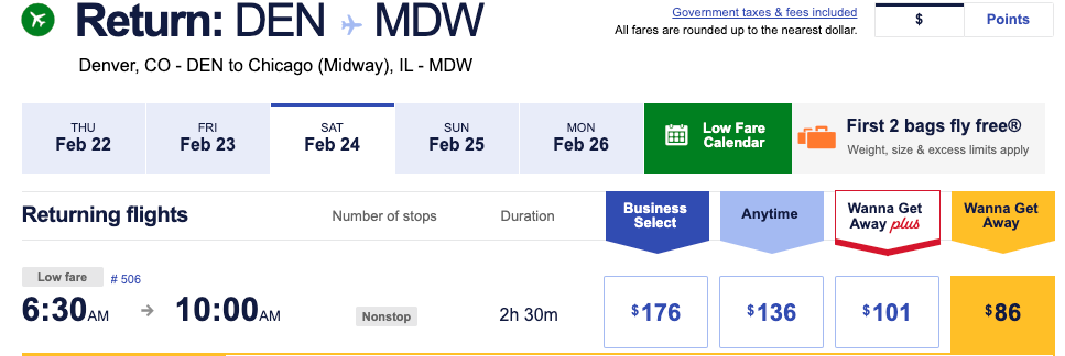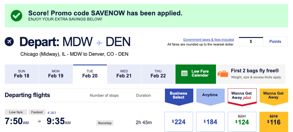 For example, searching for a round trip from Chicago's Midway International Airport (MDW) to DEN in late February revealed that discounted flights to DEN are available for $116, as shown below.